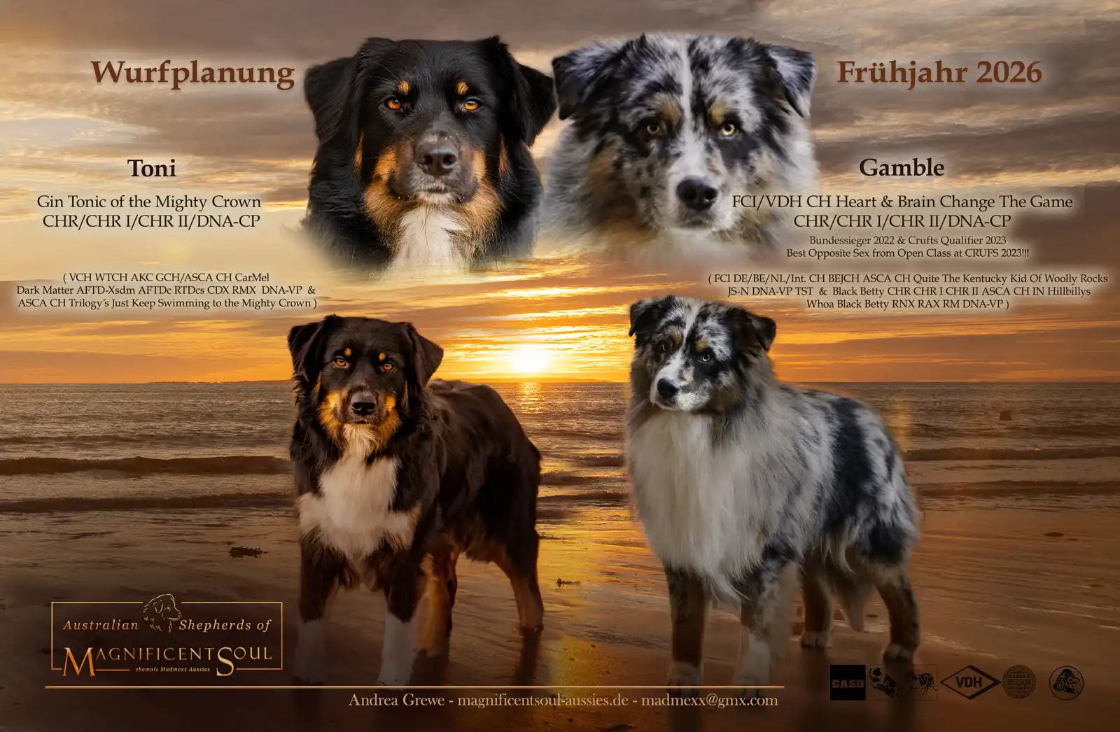 Aus dieser Verpaarung erwarten wir die Farben black tri, blue-merle und wenn Toni red factored ist, auch rot.
